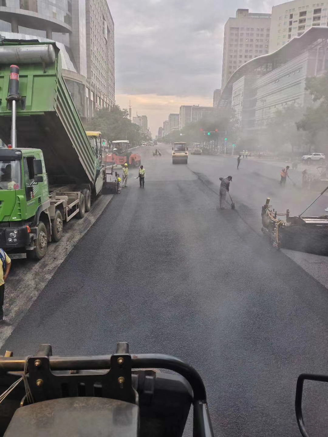 鄭州一環(huán)十縱十橫:京廣路航海路三套攤鋪設(shè)備,經(jīng)三路黃河路四套攤鋪設(shè)備同時進(jìn)行。